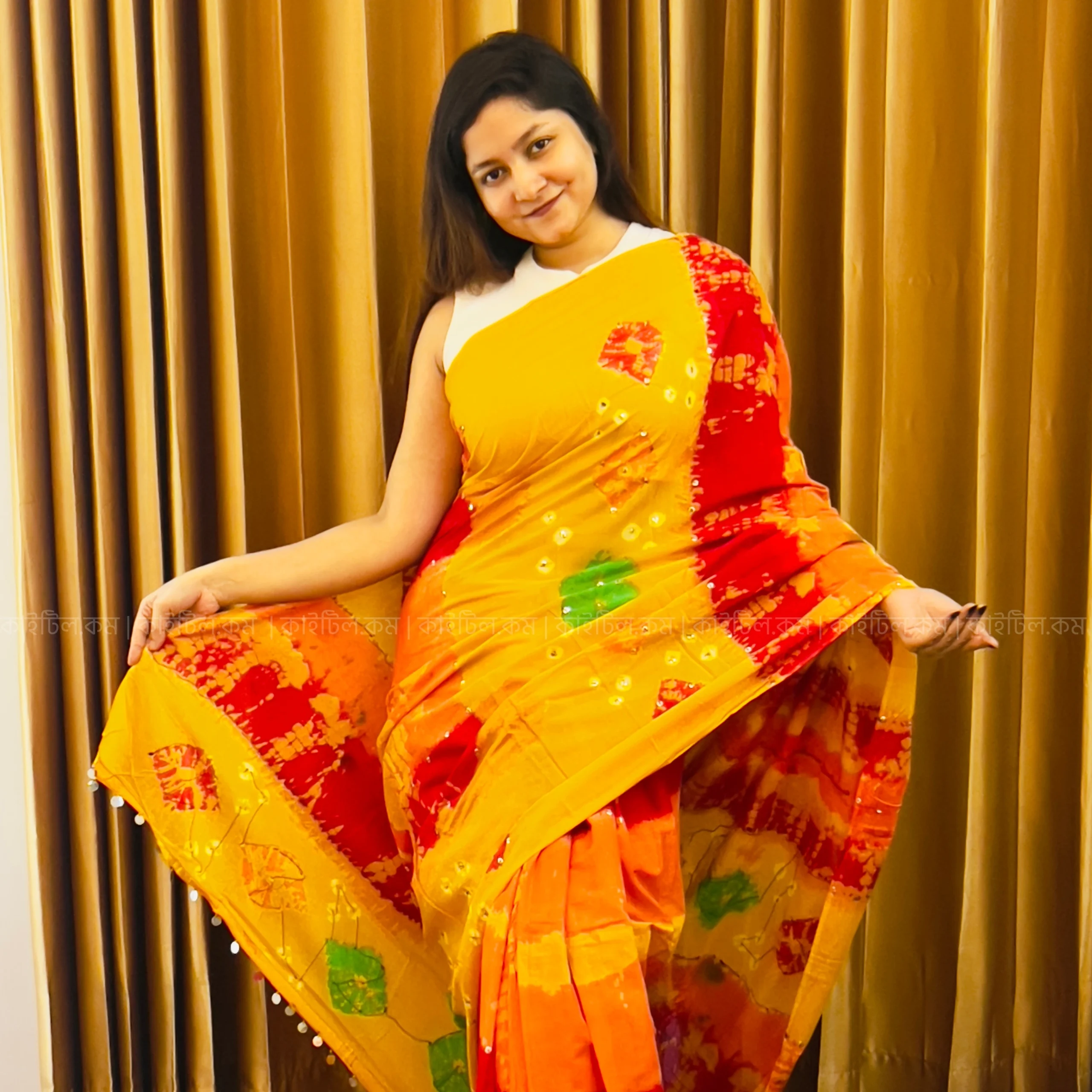 ডিজাইন: কুমিল্লার ঐতিহ্যবাহী নিপুণ বাটিক প্রিন্টের উপর আকর্ষণীয় চুমকি কাজ।